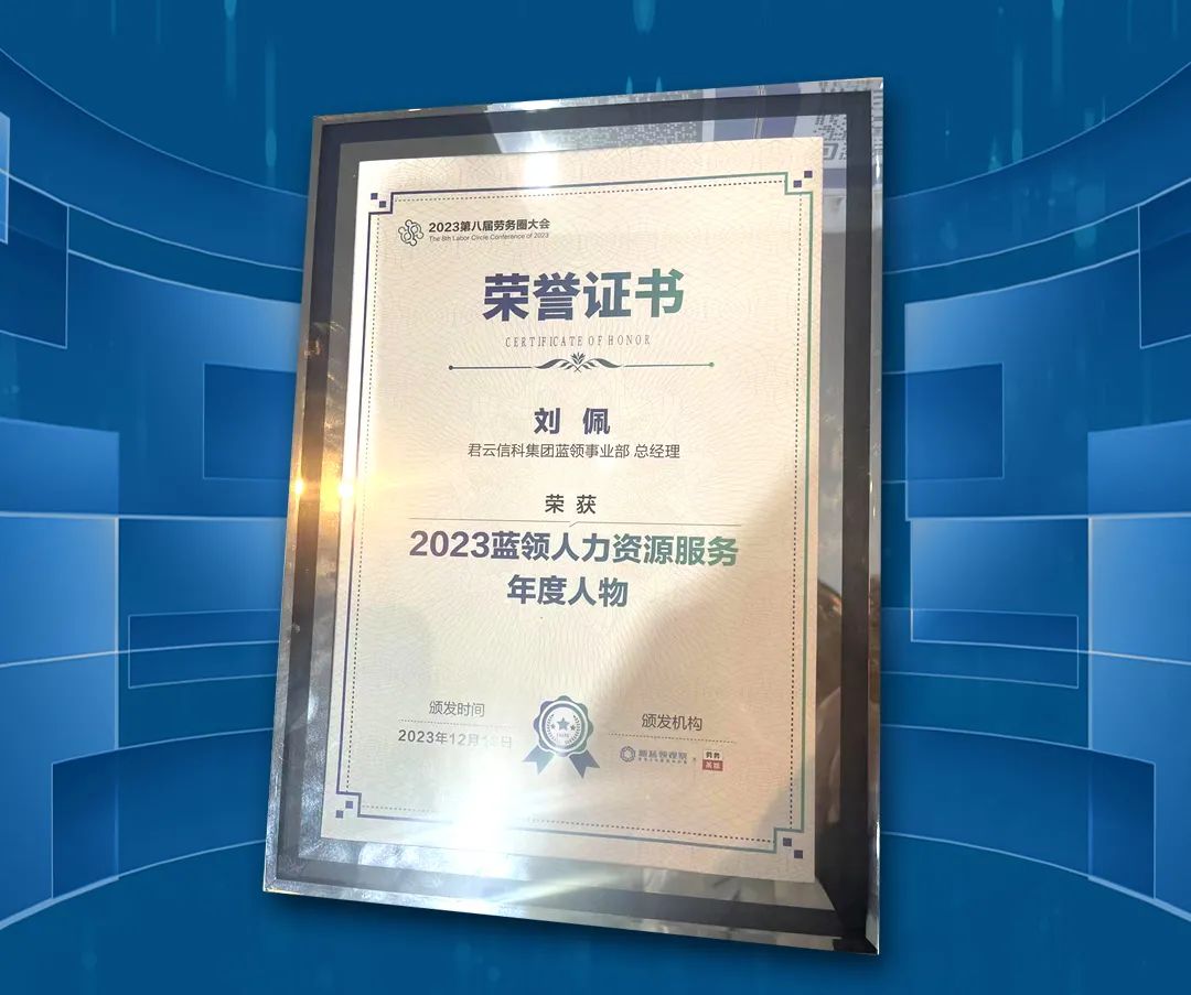 本届大会为了促进蓝领人力资源行业健康、可持续发展,提升蓝领人力资源服务质量与水平,树立行业标杆与典范,劳务茶馆&新蓝领观察特发起“2023蓝领人力资源服务年度人物”评选活动,君云信科蓝领事业部总经理刘佩荣获“2023蓝领人力资源服务年度人物”。