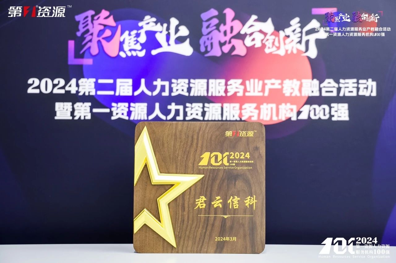 2024年3月29日,由上海市嘉定区人力资源和社会保障局指导、第一资源主办、上海嘉定新城发展有限公司联合主办、上海人才服务行业协会支持的“聚焦产业 融合创新——2024第二届人力资源服务业产教融合活动暨第一资源人力资源服务机构100强发布”成功举办。君云信科受邀出席本次活动并成功上榜“2024第一资源人力资源服务机构100强”