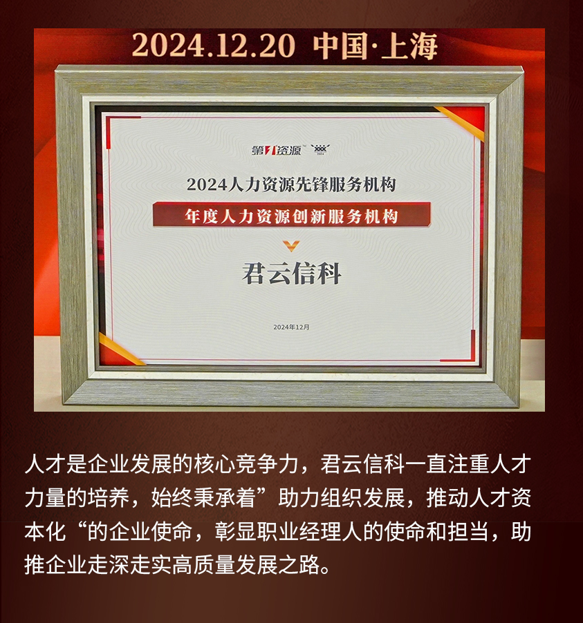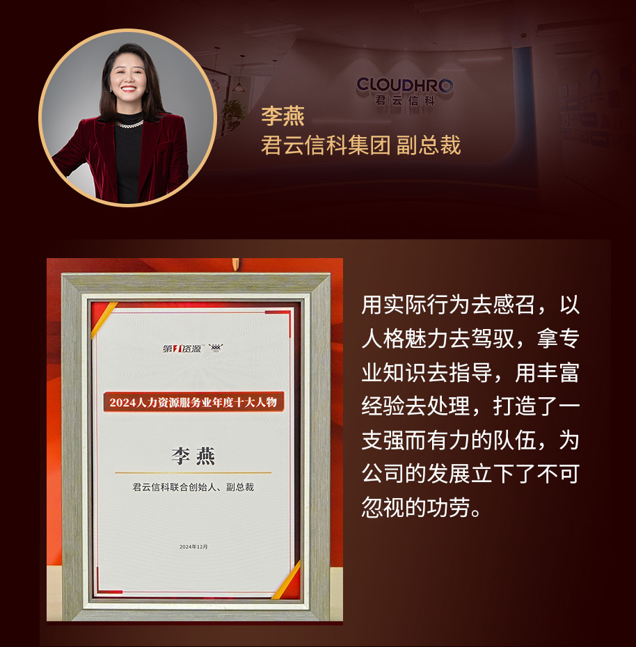 君云信科集团把握时代脉搏,坚持深耕行业领域,紧跟高质量发展的时代趋势,在此次评选活动中荣获“第一资源 2024人力资源先锋服务机构”称号!集团副总裁李燕女士荣获“2024人力资源服务业年度十大人物” 称号。