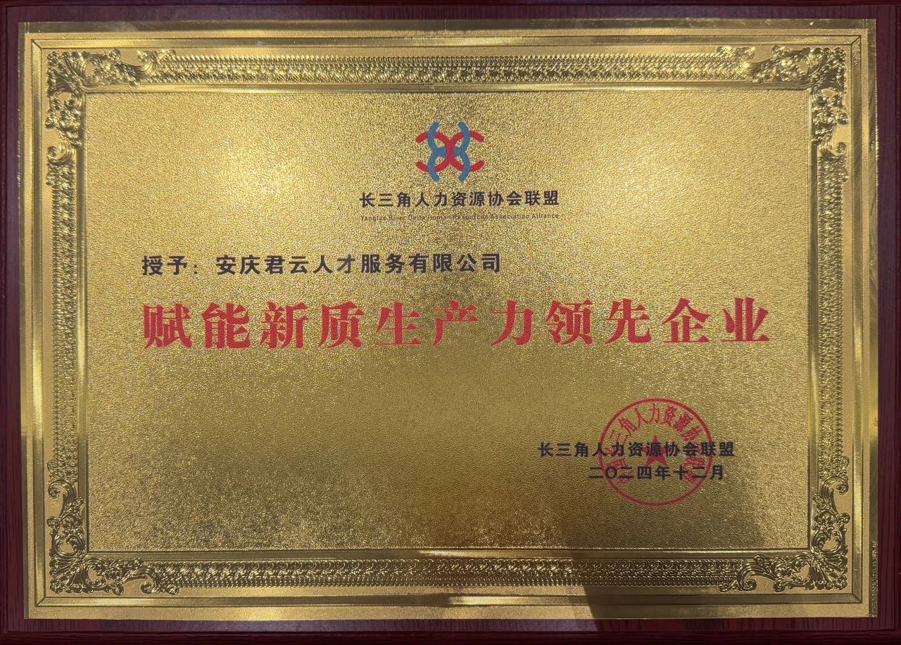 安庆君云人才服务有限公司获评长三角人力资源服务赋能新质生产力领先企业。